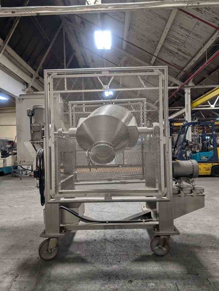 Used 3 cu ft Stainless Steel Slant cone Double Cone Blender. Manufactured by GEMCO. Rated 90#/cu ft maximum density. High speed intensifier bar with 3/1.5 hp, 460 volt motor, 1 hp shell motor drive. Stainless steel frame and legs. Solid top cover. Manual butterfly valve discharge. Cage guard. Serial# B-88286. Built 1988.