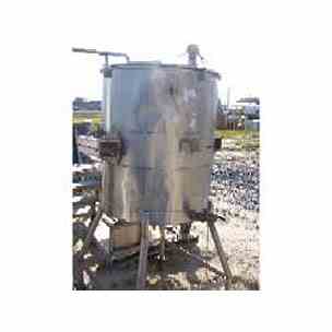 125 gallon portable stainless steel tank, flat bottom with removable lid. 32" diameter x 36" high straight side. Has filtering screen located approximately 4" from bottom of tank. Lid has 3" sightglass, (1) 1" and (1) 2" inlet. (1) 1" side bottom discharge and a 1" center bottom discharge mounted on SS legs with casters.