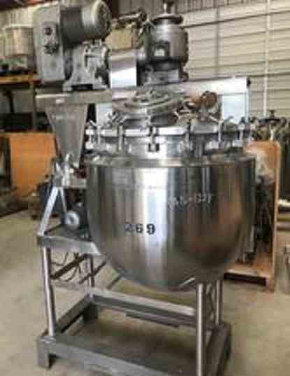 Used approximately 100 gallon stainless steel sanitary vacuum kettle. Internal rated 15 psi @ 287 degrees F. Jacket rated 40 psi @ @ 287 degrees F. Sweep scraper agitator with center mounted shaft through shaft high speed homogenizer mixer. Vari speed drive. Bolted dished top. Hemi bottom with center bottom outlet