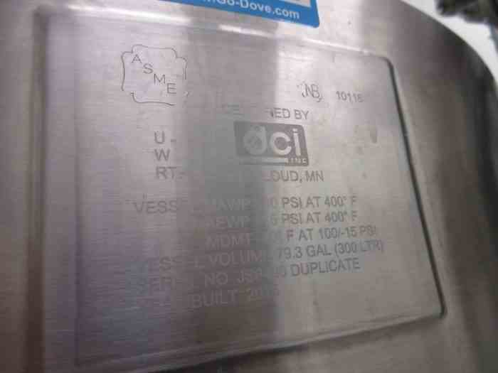 75 Gallon (300 Liter) Hastelloy C22 Pressure Vessel, 100 psi Internal, New in 2015. Internal pressure: 100 psi @ 400°F. Dish top, dish bottom. Mounted on (3) stainless steel legs. Manufacturer: DCI Inc. Year: 2015. Serial: JS6490. NB# 10118.