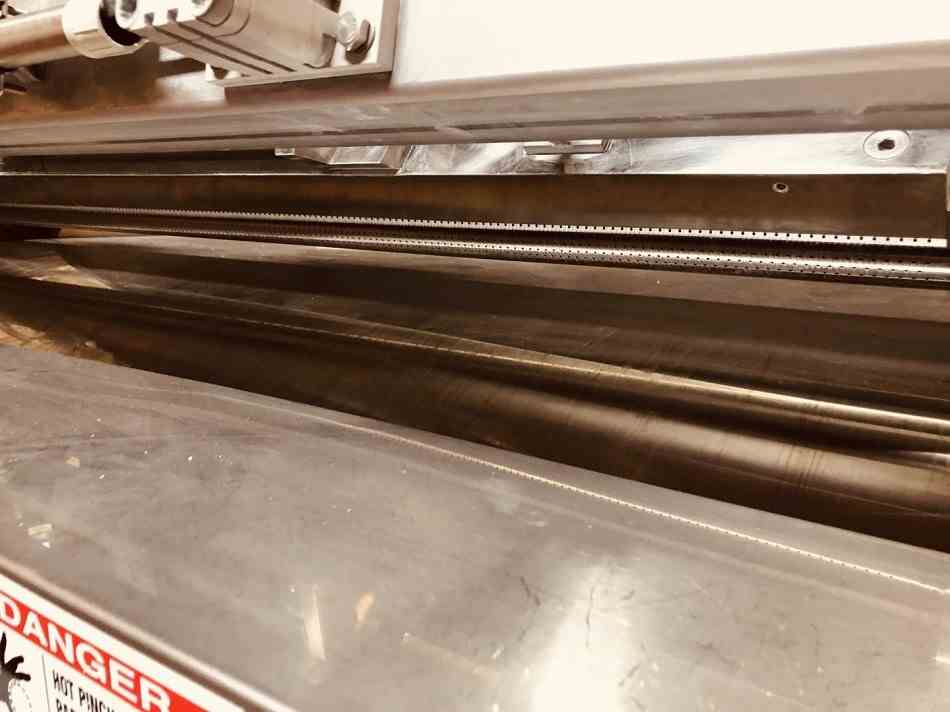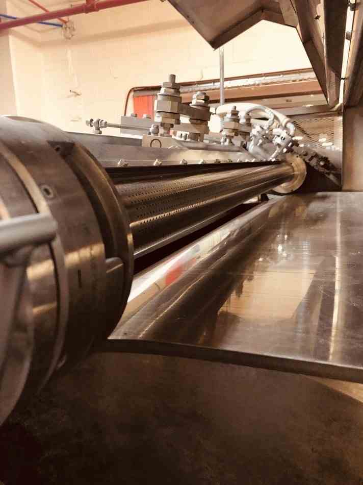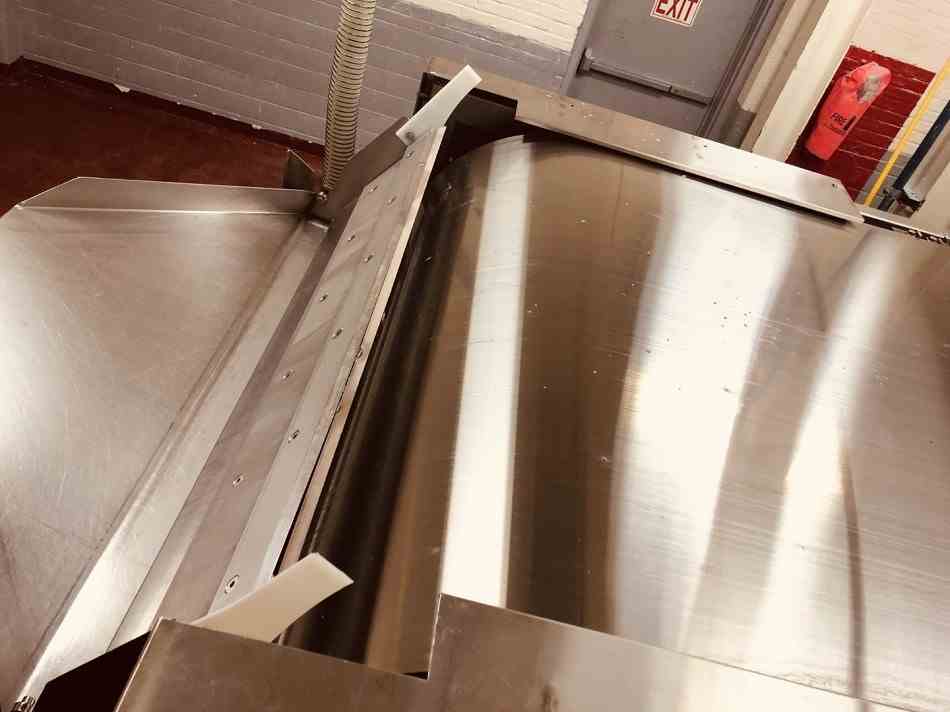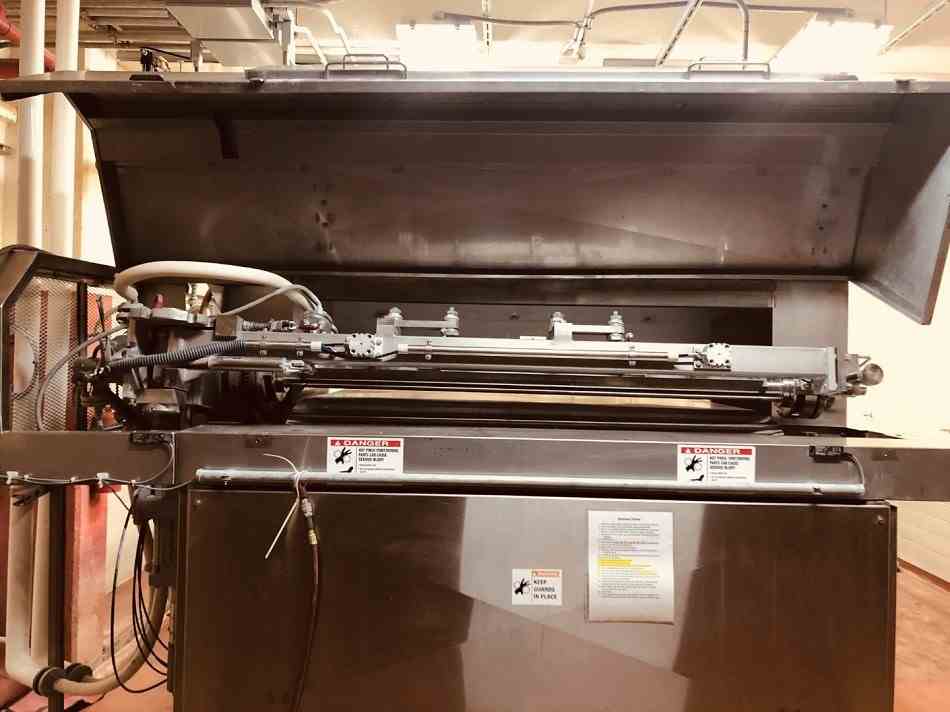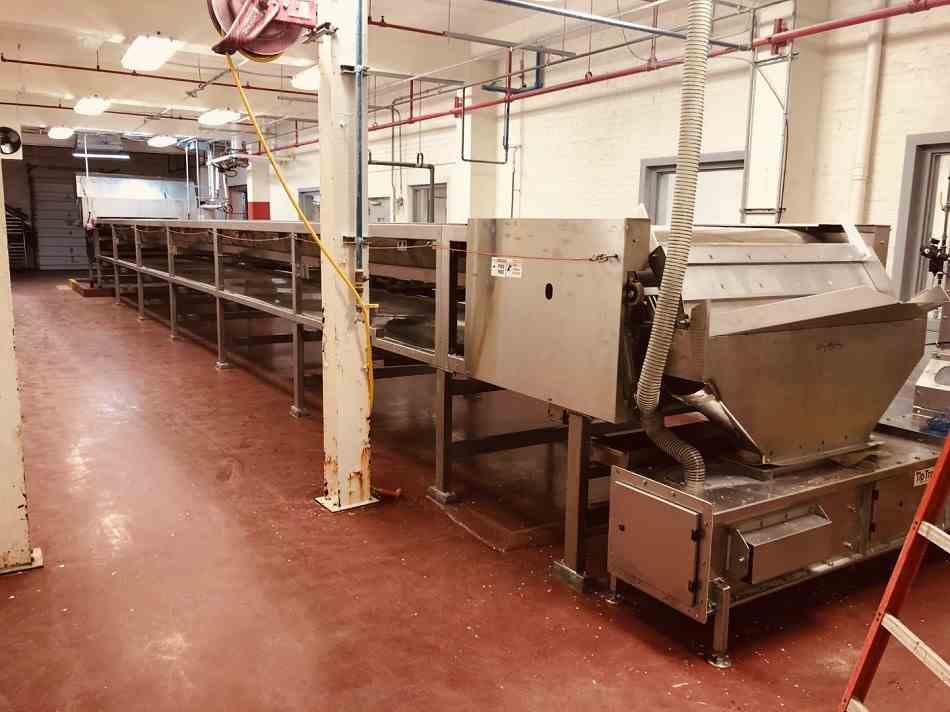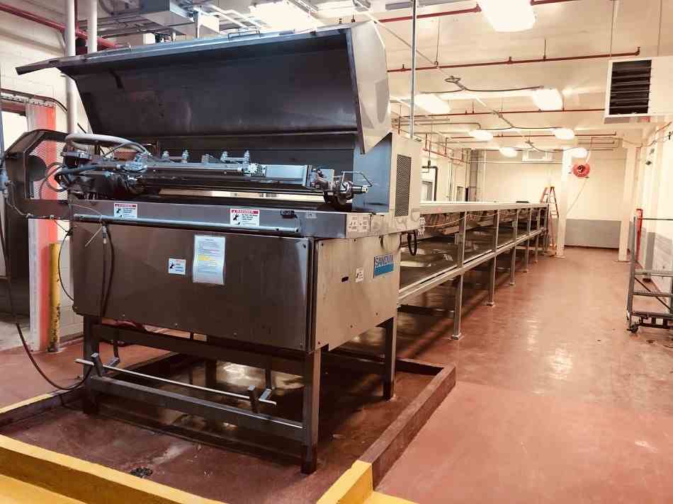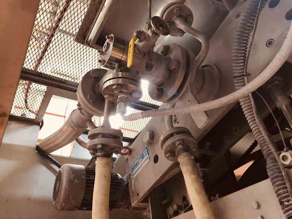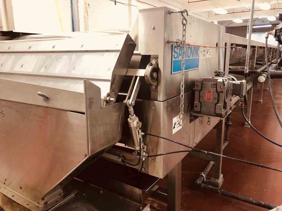 Used Sandvik belt flaker with Pastillator, approximately 59" wide x 58.5' long belt, type 1000SA stainless steel belt, with True-Track, 48' cooling tray with belt washing, Model RF-4G rotoform pastillator driven by 2 HP motor drive, scrapper discharge with pneumatically adjusted scrapper, 1 HP belt motor drive, 460 volt with control panel, operator panel, water recirculation skid with 270 gallon stainless steel tank, Alfa Laval plate heat exchanger and 7.5 HP Peerless circulation pump, Sandvik Job# R100994, ID# 1019870, Built 2014.