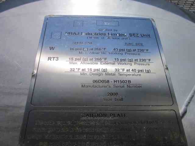 Unused 7782 Sq Ft 316 SS Shell and Tube Heat Exchanger. Mfg Praj Industries. Shell MAWP 16 PSI@266F. (1100) 1.5" OD 4-pass Tubes MAWP 40 PSI@230F. 6'OD x 27'8"OAL. (2) Saddle mounted. National Board #29. Serial #06D058-H1502B. Built 2008.
