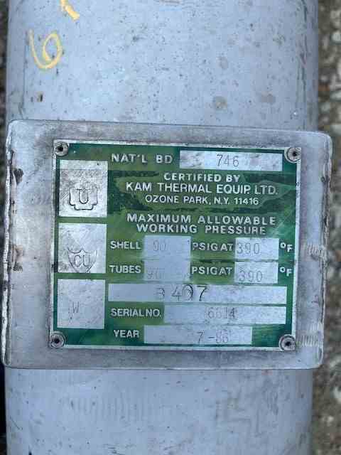 Used 92 Sq Ft 316 Stainless Steel Horizontal Shell and tube heat exchanger. Manufactured by Kam Thermal. 316 SS Shell rated 90PSI @390F. (56) 316 SS tubes rated 90PSI @390F. 10" dia x 9'10" length. Serial #6614. National Board #746. Built 1986.