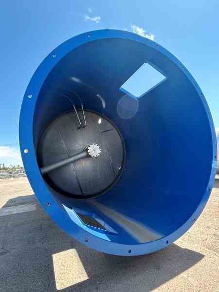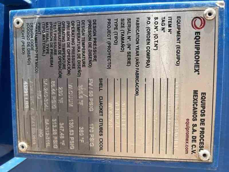 Unused 19570 gallon 304L Stainless Steel Vertical mixing vessel. Manufactured by Equipmex (Mexico). Internal rated 50PSI/FV@306F. Coils rated 17PSI@380F. 3HP agitator: Chemineer Model #22GTN-3, 1200 rpm input, 30 rpm output, 230/460 volts. Dims: 12'6" OD x 17'9" T/T. Dished top and bottom. 24" manway with davit. 14' skirt mounted. Empty weight 45291 lb. National Board coded. Built 2022.