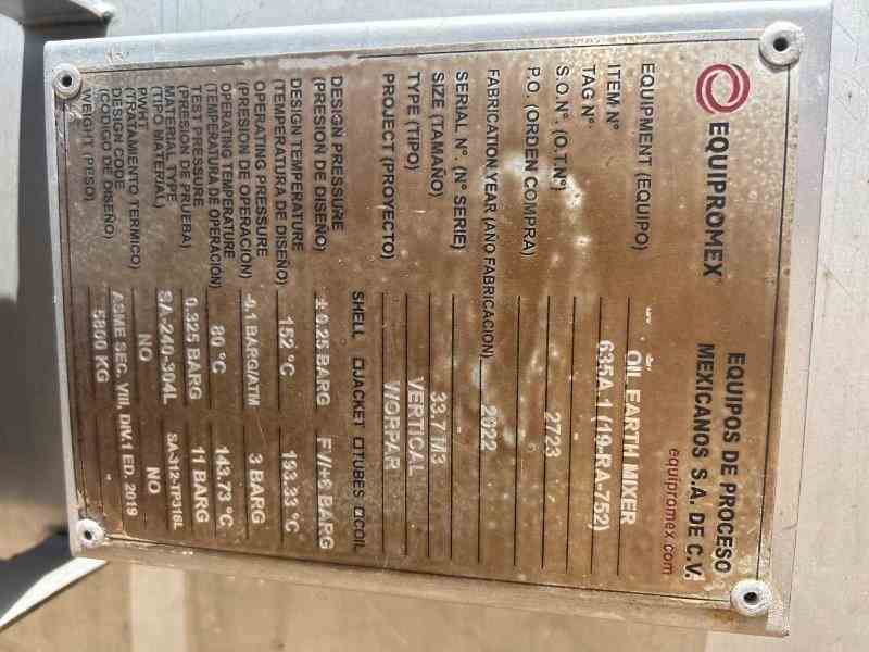Unused 8901 gallon 304L Stainless steel vertical tank. Manufactured by Equipromex (Mexico). Internal rated ATM@306F. 316SS Coil rated 87PSI/FV@380. Chemineer Agitator Model #12MRA-3, 3 hp, 1800 rpm input, 45 rpm output, 230/460 volts. Dished head and bottom. Leg mounted. 12768 lbs weight. Built 2022. Designed as Oil-Earth Reactor.