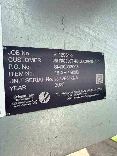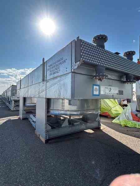 Unused 59407 sq ft finfan heat exchanger, two different bundles. Manufactured by Kelvion Thermal Solutions. Carbon Steel tubes and header. With combined 3871 Bare sq. ft. and 81214 Extended sq. ft. 2857 bare sq. ft. 59,407 extended sq. ft. 30'0" tube length. 125 FV Design Pressure @385 deg. F Design Temperature. With (2) 30 hp fans. (1) bundle,(8) rows, 2 passes. 372-1"od x .083"mw. (2)8" inlets and (2)8"outlets. Built 2023.