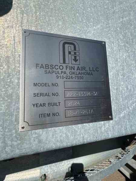 Unused 48027 sq ft (2287 bare sq ft) Carbon Steel finfan heat exchanger. Manufactured by Fabco. Rated 135psi/FV@ 300F, 41.1 MMBTU/hr design duty. 26'0" tube length. (2) 25 hp fans. 336-1"od x .083"mw. (2) 4" inlets and (2)4" outlets. Dimensions: 31'0" l x 12'4" w x 10'3" h (with Platform), 40,000 lbs weight. Designed as Lean Amine Coolers. Under Nitrogen Purge. Built 2024.