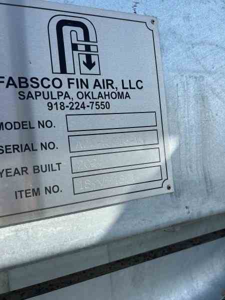 Unused 43387 sq ft Carbon Steel finfan heat exchanger. Manufactured by Fabsco. 2060 bare sq. ft. 24.36 MMBTU/hr design duty. 24'0" tube length. Rated 232psi/FV @430F. (2) 15hp fans. 328-1"od x .095mw. (2)8" inlets and (2)4" outlets. Dimensions: 34'10" l x 14'10" w x 10'10" h (with platforms) 14'2" w (w/o platfroms), 40,295 lbs weight. Designed as Excess MP Steam Condenser. Built 2023. Under Nitrogen Purge.