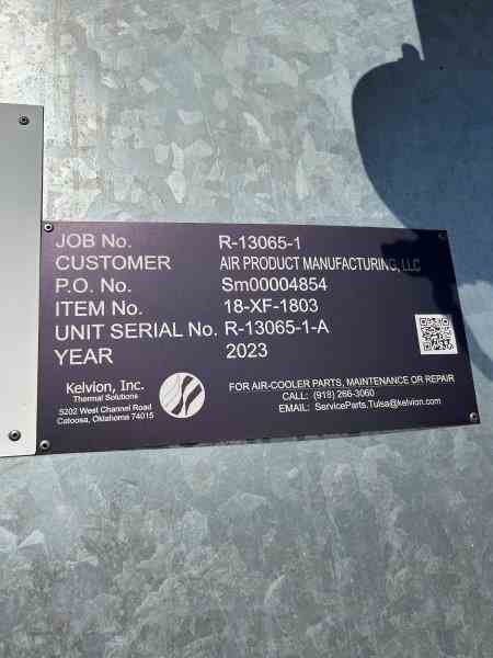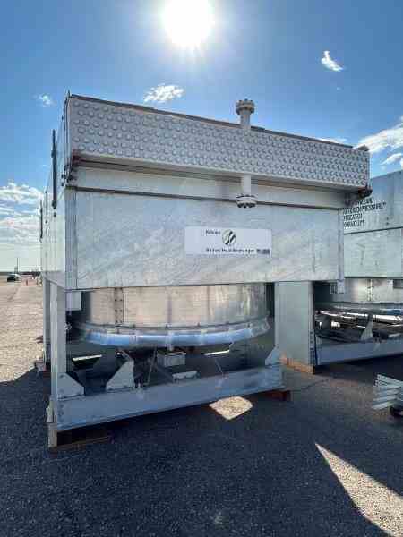 Unused 31917 sq ft finfan carbon steel heat exchanger. Manufactured by Kelvion Thermal Solutions. 1484 bare sq ft. 8.24 MMBTU/hr design duty. 22'0" tube length. Rated 200psi/FV @300F. (2) 15 hp fans. 264-1"od x .095"mw. Model #1-1022T096. (2)4" inlets and (2)4" outlets. Dimensions: 23'0" l x 9'6" w x 11'6" h, 22,200 lbs weight. Designed as HGU Condensate Air Cooler (for HGU Feed). Under Nitrogen Purge. Built 2023.
