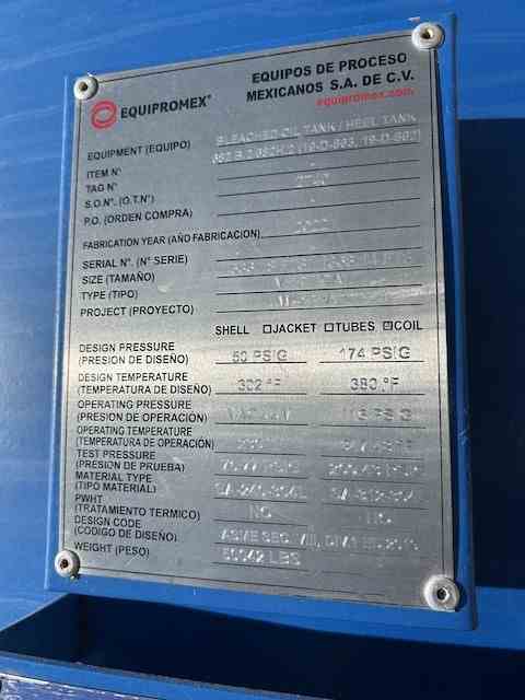 Two Vessels in one: Total Combined Capacity 18,100 gallons. Tag #19-D-862 One unused 8600 gallon vertical 304 stainless steel vessel with 304L stainless steel internal coils. Mfg. by Equipromex (Mexico) in 2022. Heel collecting tank. 12'6"diameter x 9'2" T/T. 50PSI/FV@302F shell and 174/FV@380F coil. Dished top head. Tag #19-D-863 One 9500 gallon 304 stainless steel vertical vessel. 12'6" diameter x 10'6" T/T. Bleached oil filter tank. Dished bottom head. On 14'6" skirt support.