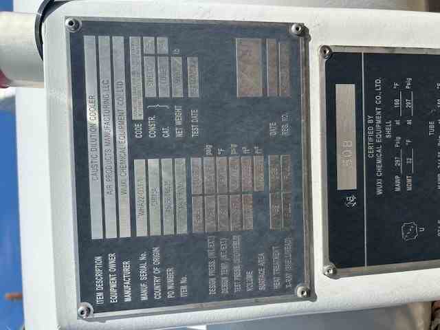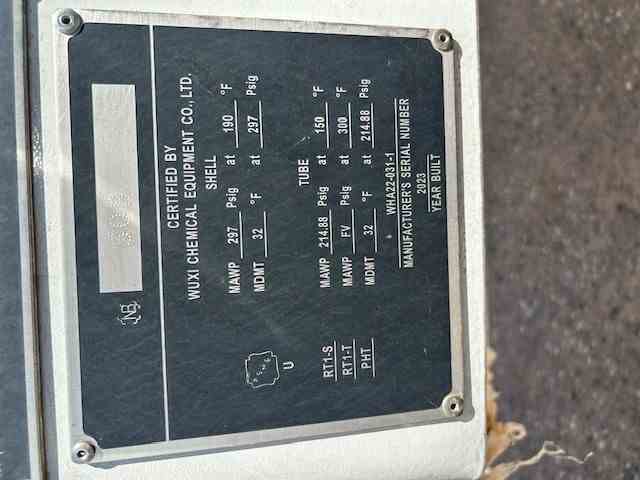 Unused 979 sq. ft. Carbon Steel horizontal heat exchanger. Mfg. by Wuxi Chemical Equipment. 2.32 Design duty (MMBTU/Hr). Shell Design Rating : 150 psig @ 190 deg. F. Tube Design Rating: 120/FV psig @ 150/300 deg. F. Shell mawp 297 psig @ 190 deg.F. Tube mawp 214.88/FV psig @ 150 deg. F. 25" X 168". Serial #WHA22-031-1. National Board #508. Caustic Dilution Cooler. Under Nitrogen Purged.
