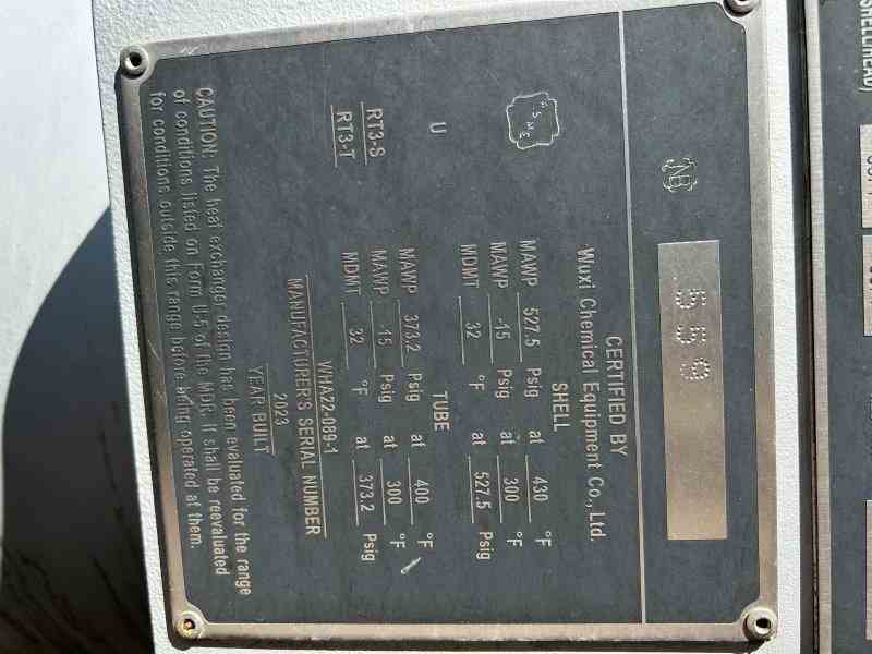 Unused 872 sq. ft. Duplex 2205 SS vertical heat exchanger. Mfg. by Wuxi Chemical Equipment (China) in 2023. 11.473 Design duty (MMBTU/Hr). Shell Design Rating: 232/FV psig @ 430/300 deg. F. Duplex 2205 Tube Design Rating: 180/FV psig @ 380/300 deg. F. Shell mawp 527.5/FV psig @ 430 deg. F. Tube mawp 373.2/FV psig @ 400 deg. F. 21.25" X 144". Serial #WHA22-089-1. National Board #559. Ammonia stripper reboiler. Under Nitrogen Purged.