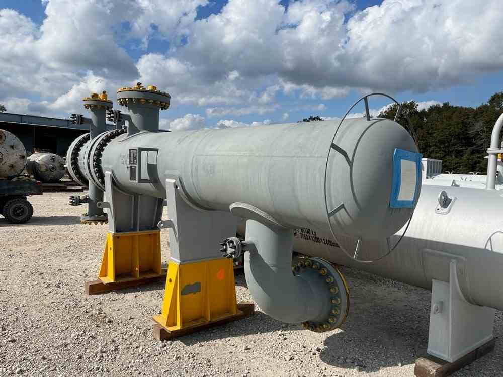 Unused 1234 sq. ft. Carbon steel heat exchanger. Mfg. by Wuxi chemical Equipment in 2023. 7.6 Design duty (MMBTU/Hr). Shell Design Rating: 250/FV psig @ 725 deg. F. Tube Design Rating: 325/FV psig @ 680 deg. F. Shell mawp 380.1/FV psig @ 725 deg. F. Tube mawp 475.8/FV psig @ 680 deg. F. 30" X 144". Serial # WHA22-021-1. National Board #539. Product Fractionator Feed/Bottoms Exchanger No. 2. Under Nitrogen Purge
