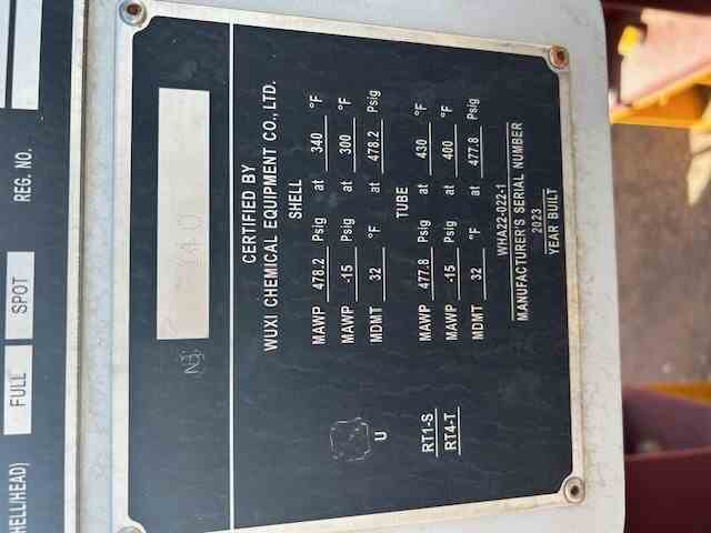 Unused 669 sq. ft. Carbon Steel horizontal heat exchanger. 6.82 Design duty (MMBTU/Hr). Mfg. by Wuxi Chemical Equipment (China). Shell Design Rating: 304/FV psig @ 340 deg. F. Tube Design Rating: 232/FV psig @ 430 deg. F. Shell mawp 478.2/FV psig @340 deg. F. Tube mawp 477.8/FV psig @ 430 deg. F. 29" X 84". Serial #WHA22-022-1. National Board #540. Built 2023. Stripper Reboiler. Under Nitrogen Purge