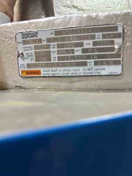 Unused Horizontal Centrifugal Pump. BFW Pump. Mfg. by ITT Goulds. Size 1.5x4-15K/S-6. 200 gpm @ 897' head. 730 psi @300 deg. F. Casing CS, No PWHT. Impeller 12 Cr (CA6NM). API Class: S-6; With 200 hp motor. Serial #GM03A854-1.
