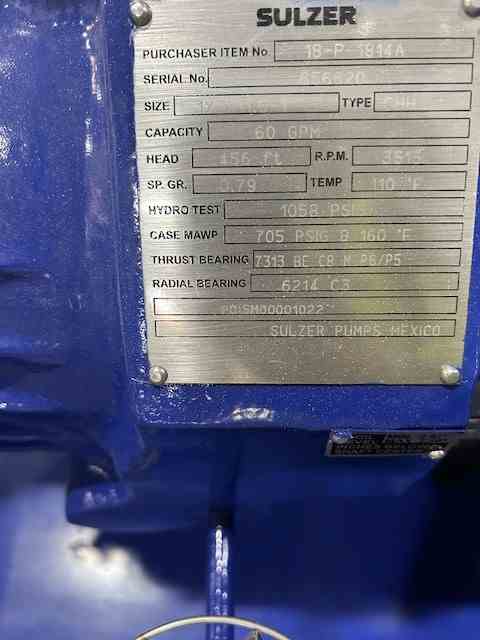 Unused 30HP Centrifugal Pump. Mfg by Sulzer. Size 1x3x11.5-1. 60 gpm @ 456.4' head. 705 psi @ 160 deg. F. Casing CS. Impeller 12 Cr. With 30 hp motor. Serial #656620. RJFU-B Seal Fluid Pump.