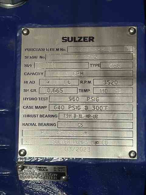 Unused 131 GPM Centrifugal Pump.Mfg. by Sulzer. Size 3x2x1.5. 131.3 gpm @ 201 head. 640 psi @ 300 deg. F. Casing CS. Impeller 316L SS. With 15 hp motor. S/N 648502. Stripper Reflux Pump.