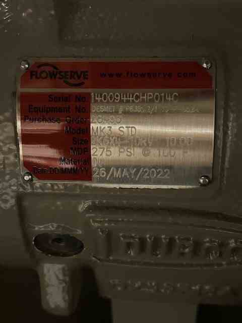 Unused 445 GPM 316SS Horizontal Centrifugal Pump. Mfg. by Durco (Flowserve). Model Mark III. 92' head. Size 2K4x3-100P-8.88. Type MK3 STD. MDP 275 psi @ 100°F. 306°F. Casing: 316SS. Impeller: CD4M. 60 HP motor. Serial #1400944CHP002C. Built as Silica Reactor Discharge Pump.