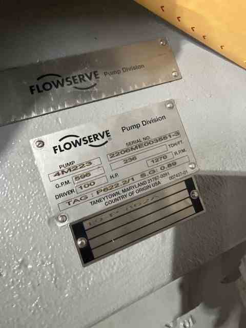Unused 597 GPM HC600 High Alloy Horizontal Centrifugal Pump. Mfg. by Flowserve. Model #4M223. 597 gpm @ 236' head. 306°F. Casing: HC600. Impeller: HC600. 100 HP motor. Serial #2206ME003551-3. Designed as Bleaching Filter Feed Pump.