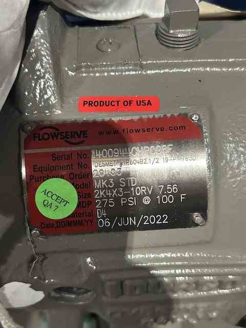 Unused 451 gpm Horizontal Centrifugal Pump.Mfg. by Durco (Flowserve). Type MK3 STD. 451 gpm @ 203' head. Size 2K4x3-10RV7.56. MDP 275 psi @ 100 deg. F. 248 deg. F. Casing: 316SS. Impeller: CD4M. 40 HP motor. Serial #1400944CHP008F. Pre-Coat Filter Aid Mixer Discharge Pump.