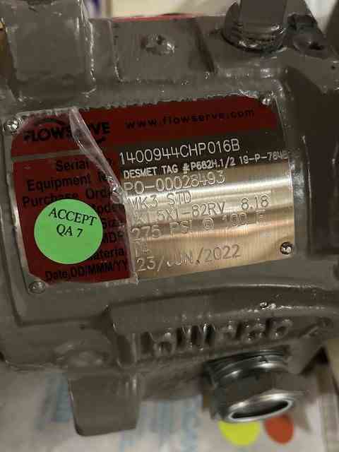 Unused 94gpm Horizontal Centrifugal Pump. Mfg. by Durco (Flowserve). Size MK3 STD. Type 1k1.5x1-82RV8.18. 94 gpm @ 148' head. MDP 275 psi @100 deg. F. 302 deg. F. Casing: 316SS. Impeller: 316SS. 15 HP motor. Serial #1400944CHP016B. Heel Collecting Tank Discharge Pump.