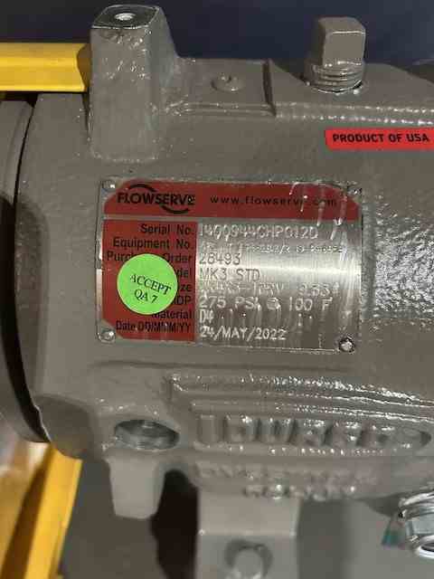 Unused 527 gpm 316 SS Horizontal Centrifugal Pump. Mfg. by Durco (Flowserve). Model Mark III. @ 358' head. Size 2K4x3-10RV-9.63. Type MK3 STD. MDP 275 psi @ 100°F. 302°F. Casing: 316SS. Impeller: 316SS. 100 HP motor. Serial #1400944CHP012D. Bleached Oil Filter Tank Discharge Pump.