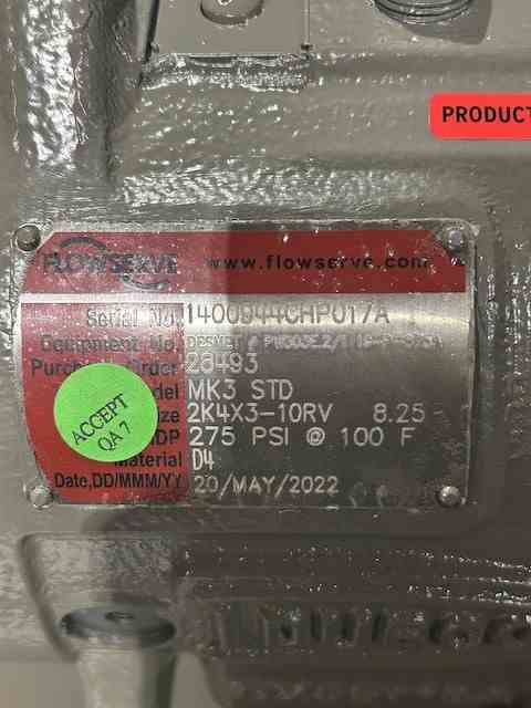 Unused 468 GPM 316SS Horizontal Centrifugal Pump. Mfg. by Durco (Flowserve). Model Mark III. 151' head. Size 2K4x3-10RV-8.25. Type MK3 STD. MDP 275 psi @ 100°F. 250°F. Casing: 316SS. Impeller: 316SS. 60 HP motor. Serial #1400944CHP017A. Designed as Enzyme Reactor Discharge Pump.