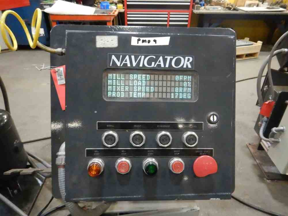 Used 25 L (6.6 gal) Premier Submersible Media Mill. Manufactured by Premier. Model PSM25. Basket Type. Mill and mixer Motors with independent VFDs. Navigator control panel. Air/Oil lift. (2) change cans - wheel mounted. Serial #PSM25.92200.01.0026. Built 2001.