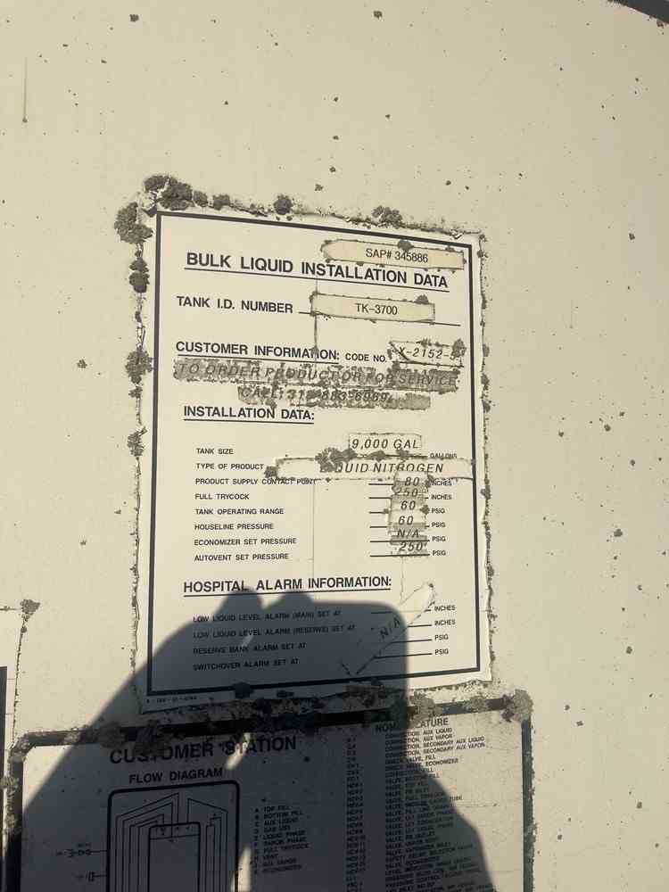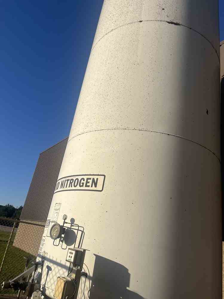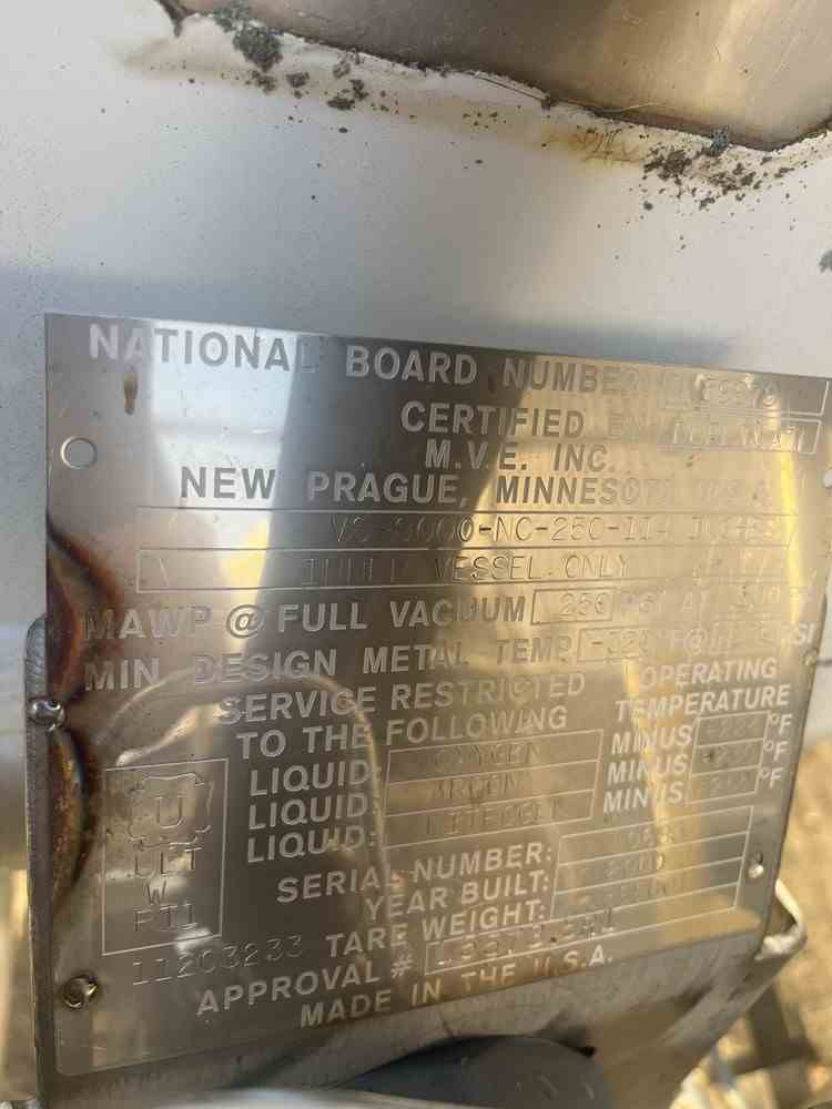 Used 9000 gallon vertical pressure vessel. Manufactured by MVE Inc. Model VS-9000-NC-250-114 Inches. MAWP 250PSI/FV@100F. MDMT -320F@250PSI. Designed for Liquid Oxygen, Liquid Nitrogen, Liquid Argon. Weight 26800 lb. Serial #10683. National Board #59878. Built 2000. Past used Liquid Nitrogen.