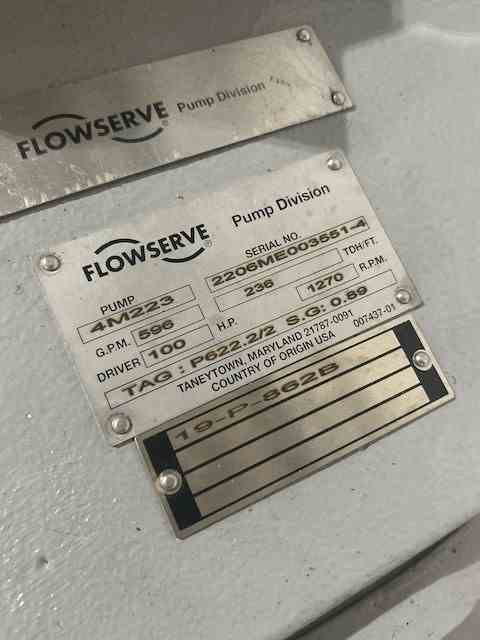 Unused 100HP Horizontal Centrifugal Pump. Mfg. by Durco (Flowserve). MODEL #4M223. 597 gpm @ 236' head. 306 deg. F. Casing: HC600. Impeller: HC600. 100 HP motor. Designed for Bleaching Filter Feed Pump.
