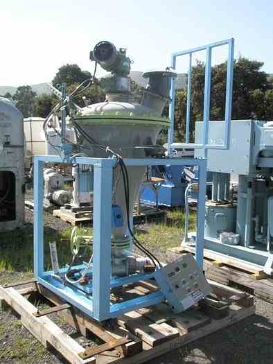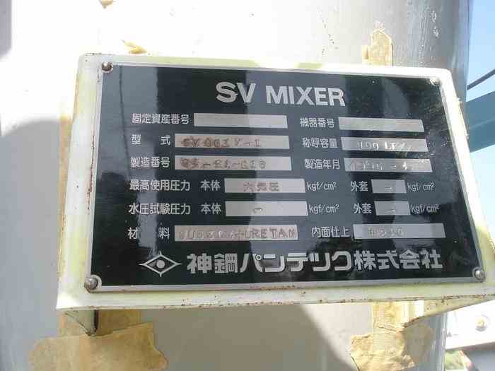 Used 3.5 Cu Ft 304 Stainles Steel Nauta mixer. Manufactured by Shinkou Pantec Co. Model SV00 V-1. 100 Liters. Urethane lining. Cone measures 30" top opening x 5" bottom opening x 40" deep. Manual slide gate with rotary air lock. Top head includes dual drive assembly to rotate Nauta mixing arm and screw. Bolted top lid with 6" diameter top feed opening. Mounted on carbon steel frame, includes controls.