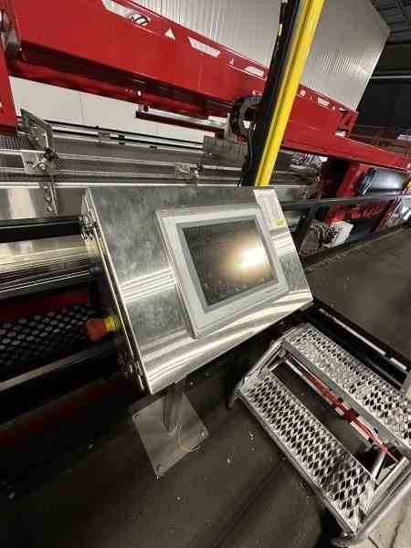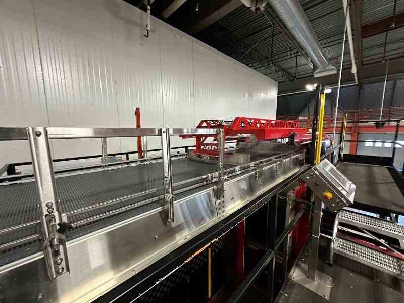 Used Codi Manufacturing DPL-1000 Depalletizer for cans. 380-500V/3ph/50Hz. Type 1 enclosure. Includes conveyors, controls and mezzanine. Serial #K048-01-2021. Built 2022. Previously used in a brewery.