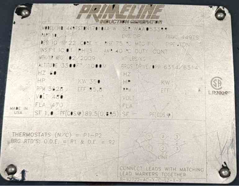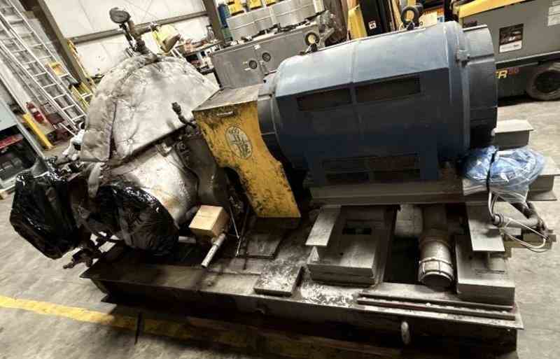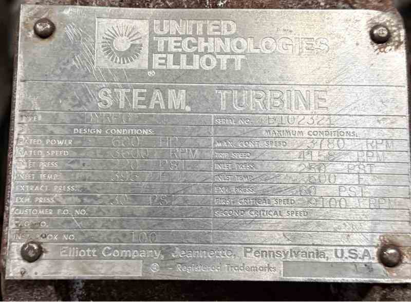 Used 350 kW back pressure steam turbine generator set, built by Elliott. Consisting of Elliot Type DYRPG steam turbine (S/N B102321) rated 600 HP, designed for 200 PSI/395°F inlet steam (max 250 PSI/600°F) with 30 PSI exhaust (max 60 PSI), operating at 3,600 RPM (3,780 RPM max continuous, 4,759 RPM trip; first critical speed 9,100 RPM). The unit is equipped with a 6” 300# inlet valve with Flowserve actuator and 12” 150# exhaust flange, carbon steel casing with sentinel valve, full instrumentation including bearing oil system, vibration sensors, steam and water gauges, and associated brackets. Direct-coupled to a Marathon Primeline induction generator, Model HB449TSTDN17010AA-W (S/N WAA053399), rated 350 kW, 3-phase, 60 Hz, 480V, 470 FLA, 0.895 PF, 95.8% efficiency, 449TS frame, drip-proof enclosure, with thermostats, bearing RTDs, terminal box, and air filter. Skid measures approximately 11’ L x 66” W x 66” H (foundation 8’ L x 53”), weighing approx. 8,000 lbs. Included is a free-standing Ewing Control turbine generator control panel (NEMA-1, 30” W x 18” D x 72” H) with Beckwith M-3410A protection relay, Allen-Bradley PLC with PanelView Plus HMI, Square D ION S6200 power meter, ABB FT-1 test switch, emergency stop, status lights, 480V–120/240V control transformer, and nVent enclosure A/C (24VDC supply required, not included). Also included is a GE Spectra Series switchboard (NEMA-1, 30” W x 30” D x 90” H) with 800A, 3-phase, 3-wire, 65 kA bus, GE Power Break II 800A main breaker (Cat# SSF08B208), CTs, PTs, and cable lugs, along with a 100 kVAR, 480V, 3-phase power factor correction capacitor bank with Square D disconnect. Unit was started up in 2009 and shut down in 2025.