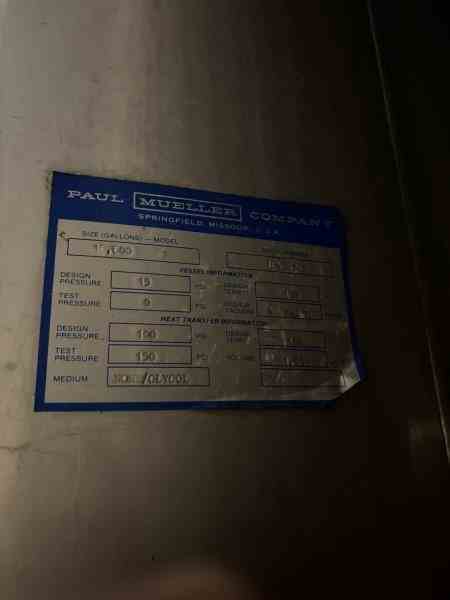 Used 16600 Gallon 304 Stainless Steel tank, jacketed, cone bottom. Manufactured by Mueller. Dished head. 10' 1 7/8" OD x 36' 11 3/8" Tall. Shell rated 15 psi @100F. Jacket rated 100 psi @100F. Weight 13200 lbs. Built 1995. Serial #164563-5. Previous use: 400 BBL brewery fermentation vessel.
