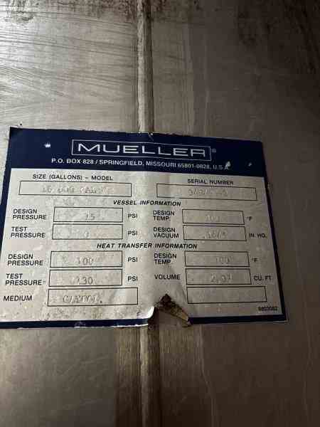 Used 16600 Gallon 304 Stainless Steel tank, jacketed, cone bottom. Manufactured by Mueller. Dished head. 10' 1 7/8" OD x 36' 11 3/8" Tall. Shell rated 15 psi @100F. Jacket rated 100 psi @100F. Weight 13200 lbs. Built 2008. Serial #349403-2. Previous use: 400 BBL brewery fermentation vessel.