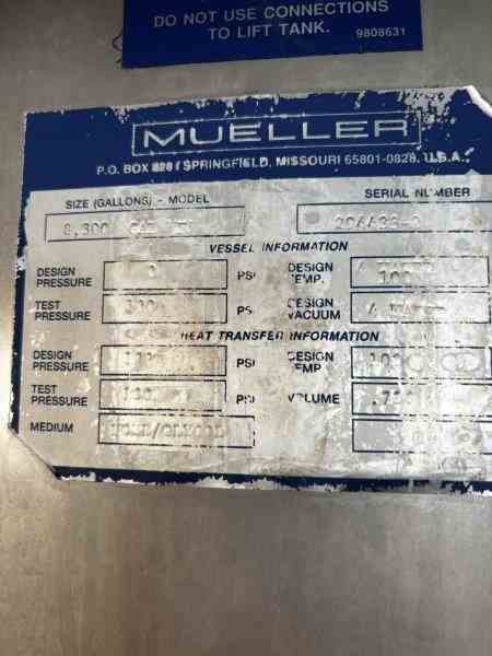 Used 8300 gallon 304 Stainless Steel Tank, Jacketed, cone bottom. Manufactured by Mueller. Model F. Internal 14.9PSI@100F. Cooling Jacket 100PSI@100F. 143"T/T x 117"ID. 267" OAH. Dome top. 16" Bottom cone manway with 3" CBO. (4) Leg mounted. Weight 8680 lbs. Serial #294433-2. Built 2010. Previous use: 200 BBL brewery fermentation vessel.