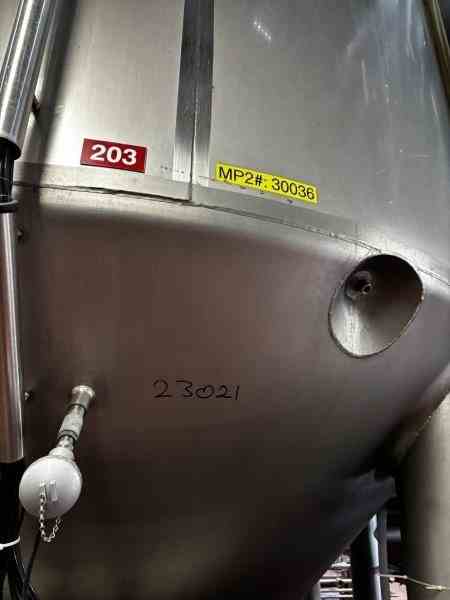Used 16600 Gallon 304 Stainless Steel tank, jacketed, cone bottom. Manufactured by Mueller. Dished head. 10' 1 7/8" OD x 36' 11 3/8" Tall. Shell rated 15 psi @100F. Jacket rated 100 psi @100F. Weight 13200 lbs. Built 2008. Previous use: 400 BBL brewery fermentation vessel.