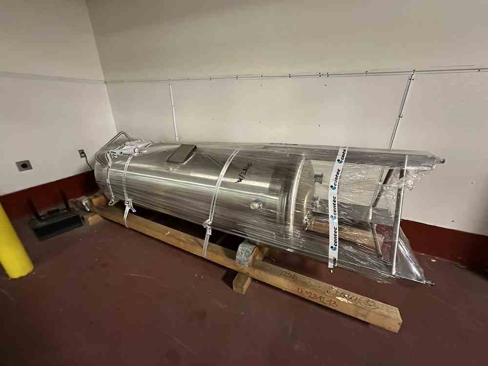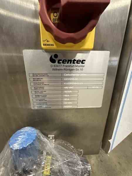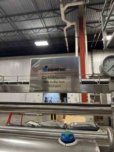 Unused Centec CarboBlender 280 hl/hr inline automated carbonation skid. 123.6 GPM. 480 VAC/60Hz. Serial #U231213-02. Includes 293 gal 304 Stainless steel vertical buffer tank and controls. Built 2024.