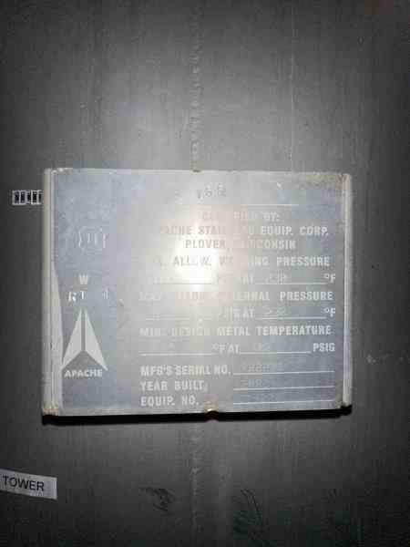 Used vertical pressure vessel. Manufactured by Apache Stainless Equipment. MAWP 100PSI@230F. Dome top, Dish bottom. (4) Leg mounted. Serial # 722201. National Board #155. Built 2008. Past Use Carbon Tower.