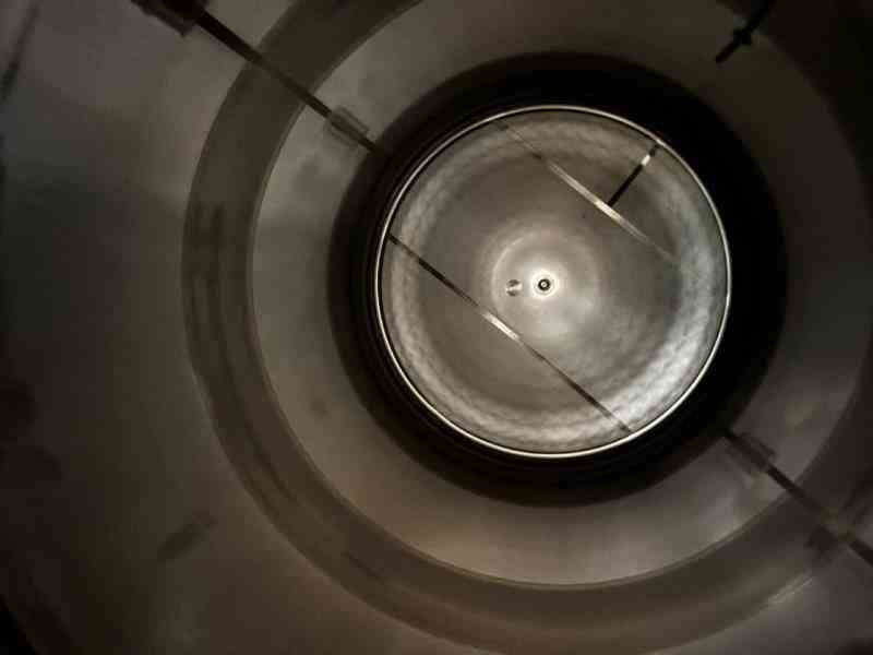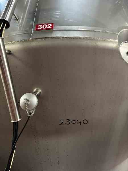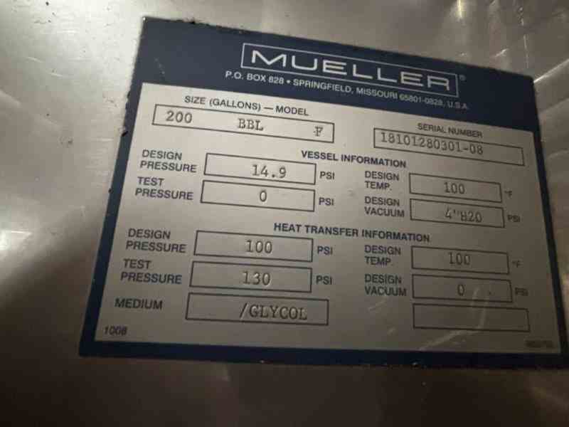 Used 8300 gallon 304 Stainless Steel tank, jacketed, cone bottom. Manufactured by Mueller. Model F. Internal 14.9PSI@100F. Cooling Jacket 100PSI@100F. 143"T/T x 117"ID. 267" OAH. Dome top. 16" Bottom cone manway with 3" CBO. (4) Leg mounted. Serial #18101280301-08. Built 2010. 200 BBL brewery fermentation vessel.