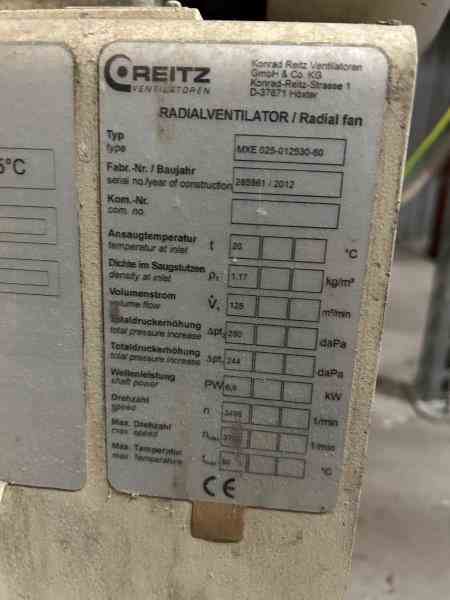 Used 125 m³/min radial fan. Mfh by Konrad Reitz Ventilatoren GmbH & Co. KG. Model MXE 025-012530-60.Inlet Density at Inlet: 1.17 kg/m³. Volume Flow: 125 m³/min. 6.9 kW motor. Serail #285861, built 2012.