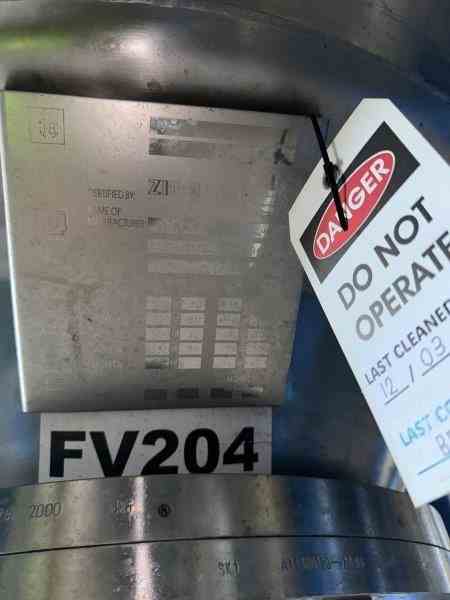 Used 6200 gallon (200 BBL) 304 stainless steel jacketed pressure vessel. Manufactured by Ziemann Bauer GmbH. Vessel Rated 19psi @86F, jacket rated 43psi @86F. 8' 6" dia x 27' tall. Dished head, cone bottom.Previously used in brewery as fermenter, cooled with Glycol @24F. National board #159. Serial #8637-14300129/2000. Built 2012.