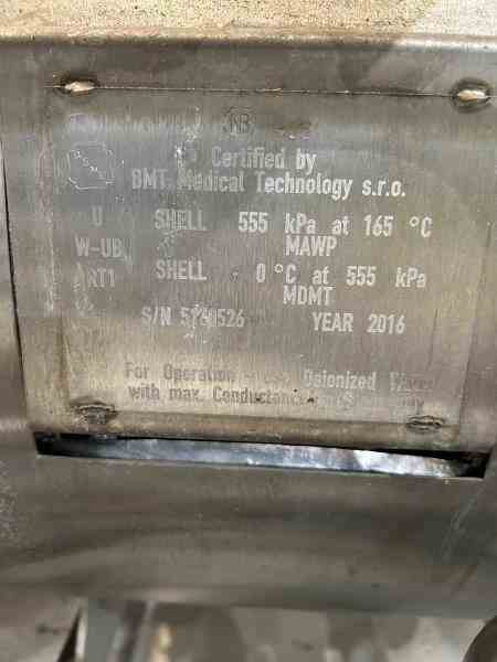 Used 400 lb/hr Electric Clean Steam Generator, manufactured by BMT USA model ECSG400. 480V/3Phase/60Hz, programmable steam pressure range of 0–90 psig. 400 lb/hr at the rated pressure, with a warm-up time of approximately 7 minutes from low-water cutoff to setpoint. Automated water level control, high-pressure cut-off, safety relief valve, touch-screen operator interface with password-protected access. OThe stainless-steel pressure vessel and sanitary connections, designed for producing clean steam for sterilization and process applications. Previously used in a brewery. Serial #SG1641003.