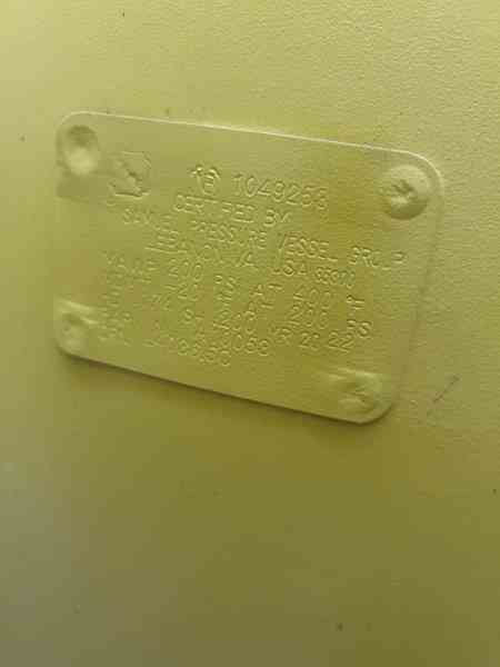 Used Air receiver. Manufactured by Samuel pressure vessel group. Rated 200 psi @400F. ASMED coded, NB #1049253.