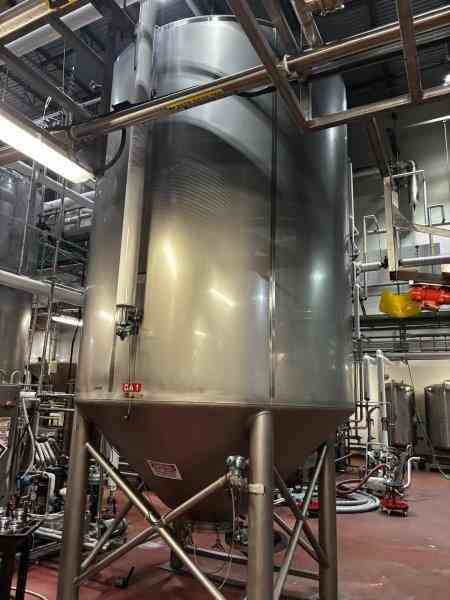 Used 4340 Gallon Stainless Steel jacketed pressure vessel. Built by Mueller. Dome Top, cone bottom. (4) leg mounted. Shell rated 15 psi @100F, jacket rated 100 psi @100F. Serial #127374-1. Past use DA tank in a brewery.
