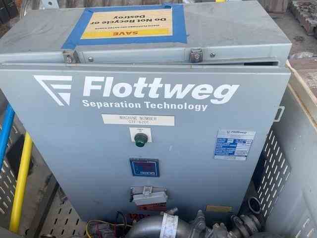 Used 24" Flottweg Decanter Centrifuge, Model Z5E-4/404. Stainless steel contacts. 3500 rpm max. 1.6 max sediment density. 100 degree C max. Pumped discharge. 14 degree beach with wear protection. Includes 75 Hp Main drive - back drive - stand. Serial# 014.108.13. Built 2009. Previously used for food.
