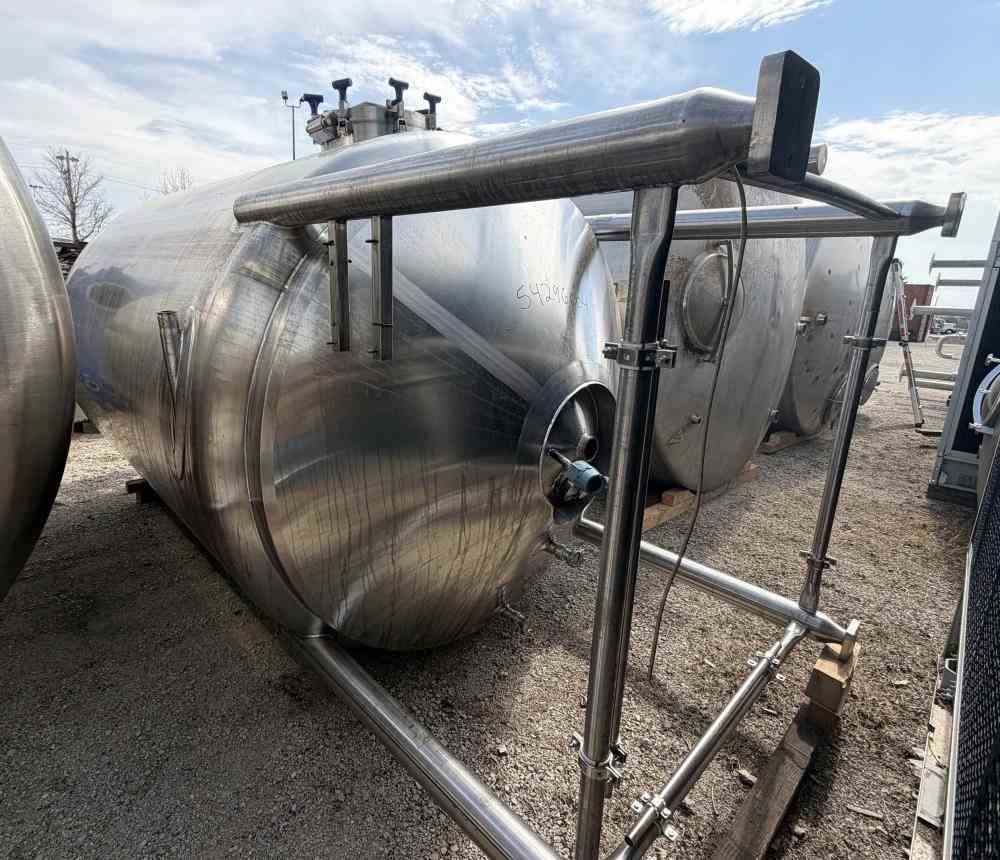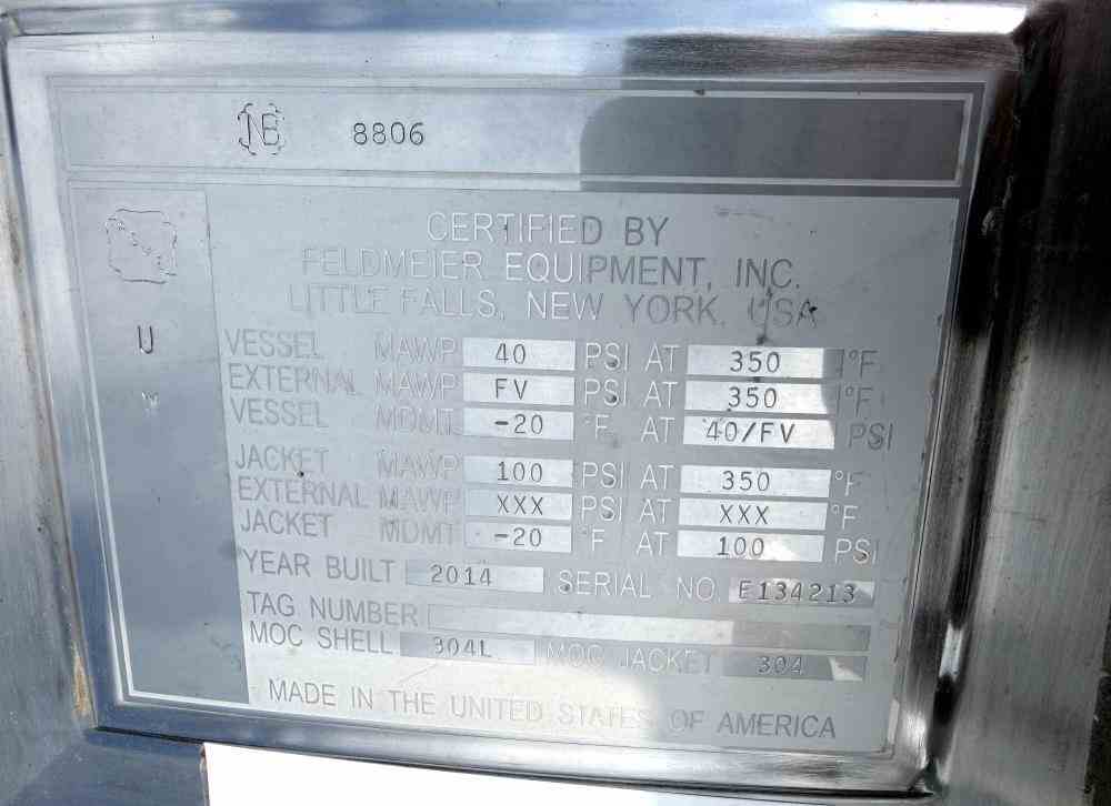 Used 2600 gallon Insulated 304 Stainless Steel Agitated Processor Tank. Manufactured by Feldmeier. 84" diameter x 102" straight side. Dish top and cone bottom. Internal rated 40/FV psi @350F. Bottom Cone only insulated and dimple jacket rated 100 psi @350F. Spray ball, baffle. Top mounted, vertical bottom sweep agitator, driven by a 2hp 3/60/230/460v 1660rpm motor through reducer. Openings Top: (2) 4", (3) 3", (2) 2", Side bottom manway, (2) 2" side openings. 3" Center bottom outlet with 28" discharge height. Mounted on (4) stainless steel legs. Serial # E134213. National Board # 8806. Built 2014.