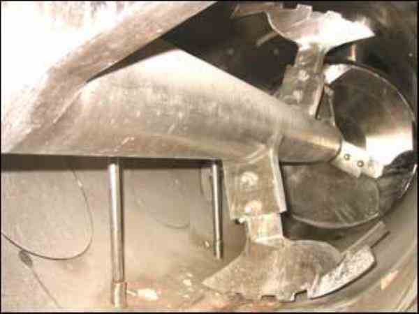 Used KM-600D Littleford Mixer, stainless steel construction, 21 cu. ft. total capacity, 11 cu. ft. working capacity, stainless steel jacket rated 75 PSI at 320 degrees F, provision for (4) choppers choppers, no choppers, (4) bottom entering liquid injectors, air purge seals, 10" x 13.5" feed port, (1) 10", (3) 4" top nozzles, end discharge with pneumatically operated slide gate valve and discharge chute, standard access doors, 25 HP, 230/460 volt main drive, Machine Serial No. 42662-5150, Jacket Serial No. 13436, National Board No. 1621. Unit New 1999 and in excellent condition.