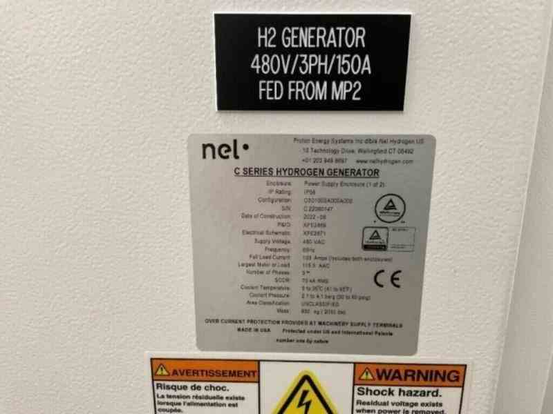 Used 10 Nm3 (380 SCF/h) hydrogen generator, manufactured by NEL. Model C-10. 99.999+% pure hydrogen production rated @435psig., consumes 6.2 kWh/Nm³ (16.3 kWh/100 SCF) power. 240V/60Hz/3Phase motor. Includes Proton Exchange Membrane (PEM) – Caustic Free. < 1 ppm v O2-Content in H2 and < 2 ppm v water content in H2. Consisting of an Electrolyser Enclosure and a power supply enclosure. Very low hours, Built 2022.