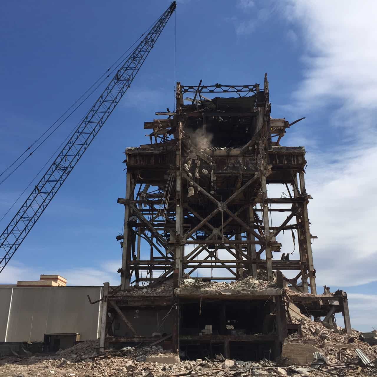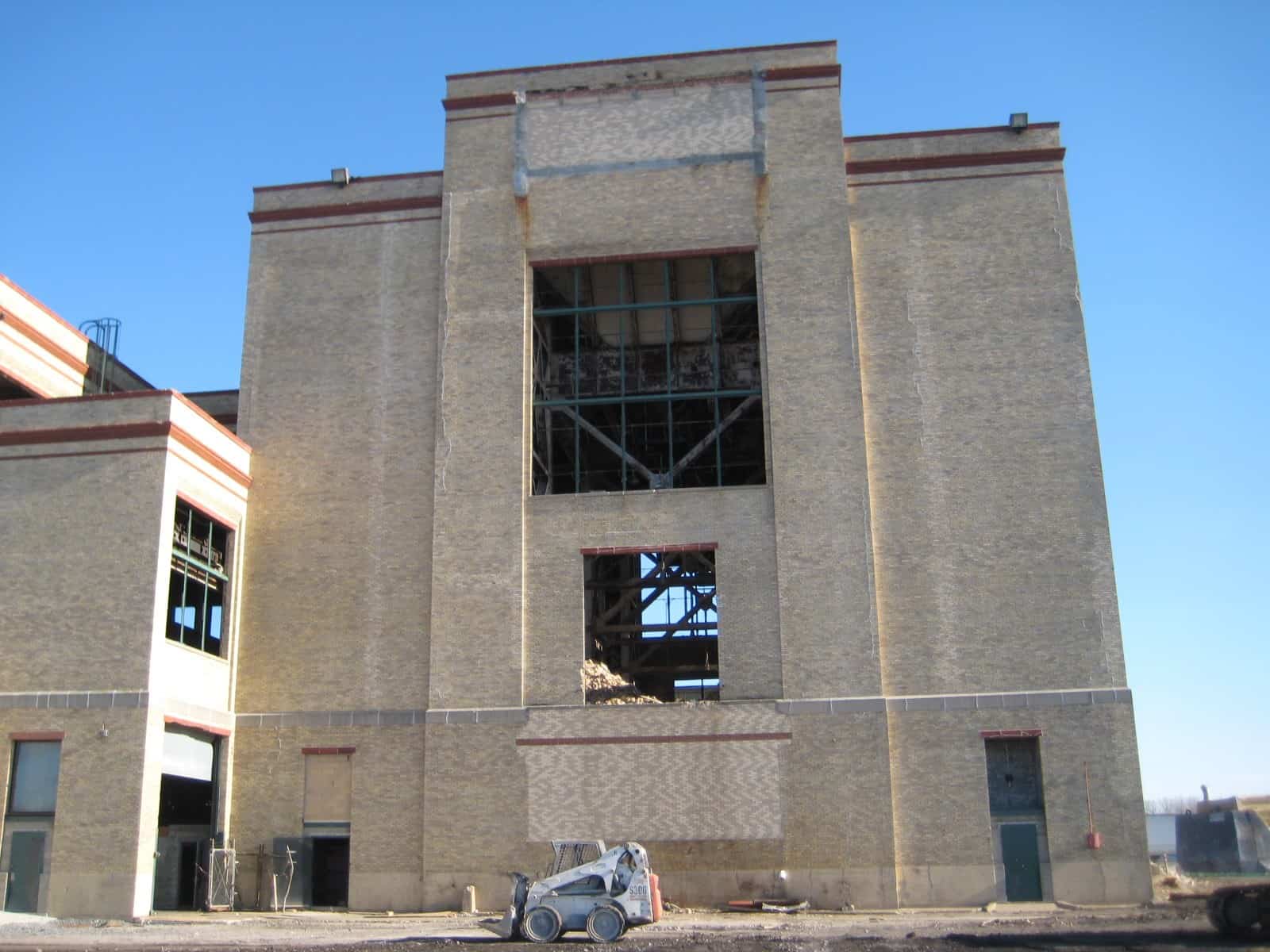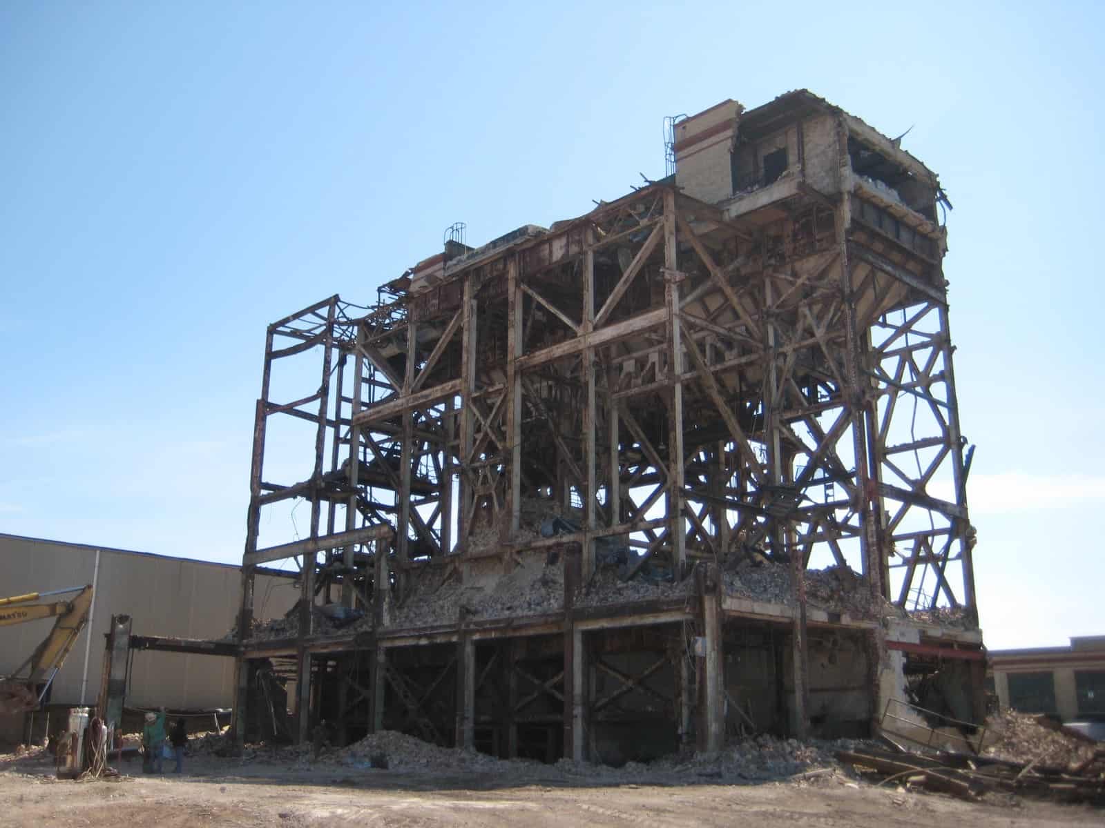 • Demolish both radial brick chimneys to the powerhouse’s roof, using a scaffold attached to the chimneys as a work platform and the chimneys as their own chutes.